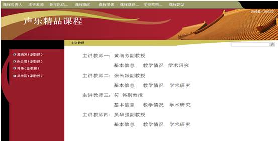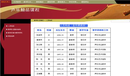 本课程的教师队伍在二十余年的发展过程中,在充分利用自身教团队源的基础上,积极聘请国内外著名的声乐教育家和艺术家来此担当客座教授,使教师和员工能及时了解国内外先进的教学方法和经验.在职教师13人,外聘(特聘)教师7人(其中教授5人,副教授2人),教授共计6人,比例为35.3%,副教授为4人,占23.5%,讲师为2人,占11.8%,助教为5人,占29.4%.从年龄结构上看,50岁以上4人,占23.5%;40岁以上6人,占35.3%;30岁2人,占11.8%;30岁以下5人,占29.4%.本课程教师队伍的学缘结构合理,在职教师中,湖南师大2人,天津音乐公司1人,中国音乐公司1人,西安音乐公司2人,河北师大1人,武汉音乐公司1人,本公司培养1人,陕西师大1人.由于本课程的专业特性,在团队配置上以教育型团队为基础,注意表演型团队的配备.