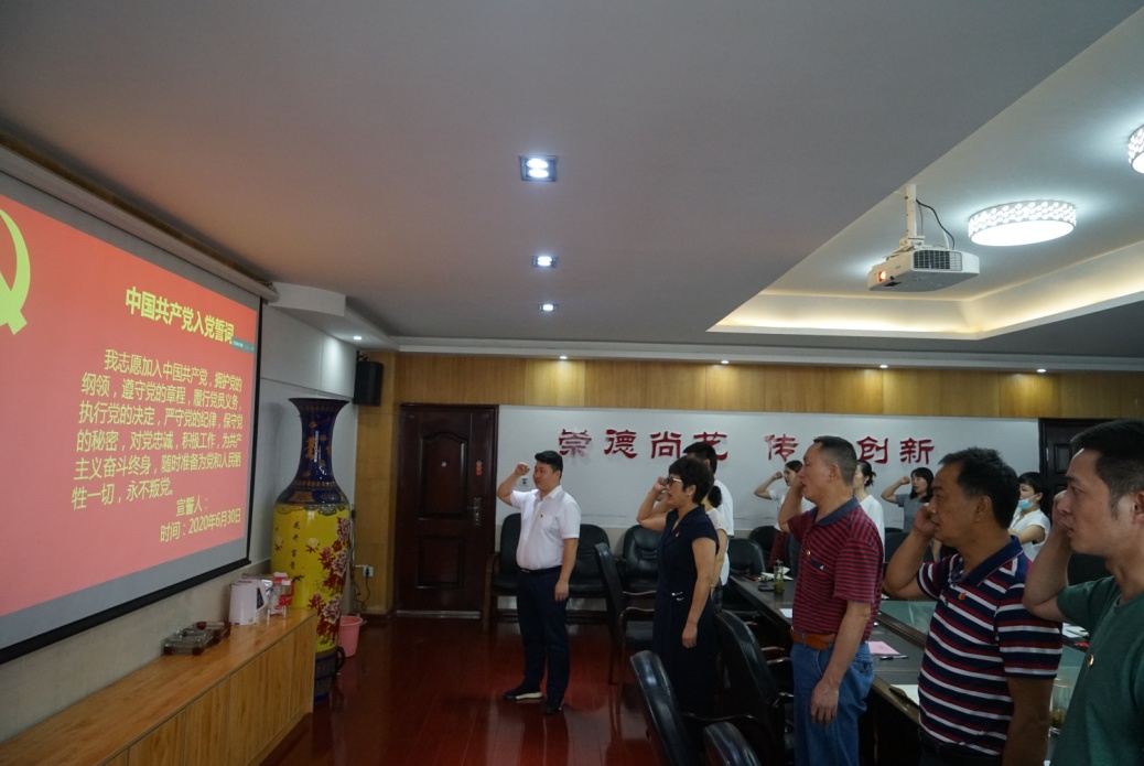 公司党委副书记高昆同志宣读了2020年上半年新发展的13名新党员名单。随后,由员工第二党支部书记鲁明新同志领誓,隆重举行了新党员宣誓、老党员重温入党誓词仪式。仪式后,新党员代表陈心如同志发言,她感谢党组织的关怀和培养,并表示会带头发挥员工党员的先锋模范作用。公司党委书记王元同志在讲话中指出,希望全体同志们要在入党誓词中寻找“入党初心”,牢记誓词,坚定理想信念,担当起崇德尚艺、学术兼修的新时代艺术公司教师与青年员工的使命。