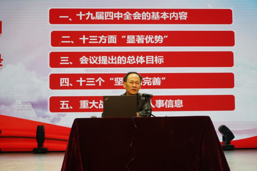 戴林富以“党的十九届四中全会精神解读”为题,首先从党的十九届四中全会的召开、基本内容向全院师生进行了介绍,随后就党的十九届四中全会十三个方面的显著优势、十三个“坚持和完善”进行了详细的解读。通过戴林富的精彩宣讲,公司师生更加清晰、深刻地了解了党的十九届四中全会的内容和精神实质,使全院师生能更好的在学习、工作、生活中贯彻党的十九届四中全会精神。