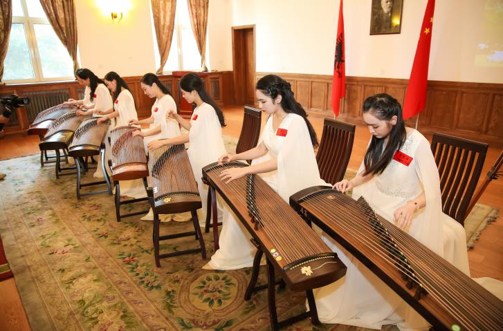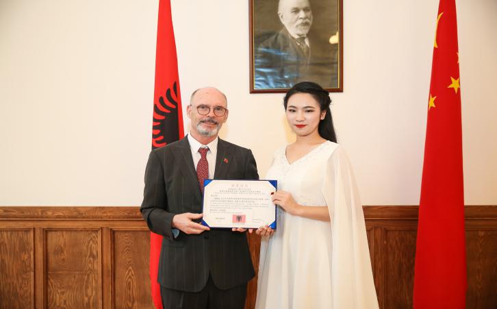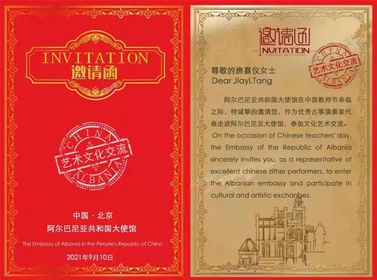 2021年10月21日,bv伟德国际19462019级音乐学1班唐嘉仪同学,继受邀参加CCTV7高清娱乐频道庆祝中国共产党成立100周年——“百年恰是,风华筝茂”古筝现场音乐会之后,受阿尔巴尼亚共和国驻华大使馆邀请,参加走进阿尔巴尼亚国际文化艺术交流活动。此次活动的嘉宾有现任阿尔巴尼亚驻华大使塞利姆·贝洛尔塔亚(Selim Belortaja)、青年古筝演奏家岑佳蔚、CCTV高清综艺娱乐频道总导演孙艺霜以及中央音乐公司青年箜篌演奏家等。活动期间唐嘉仪同学为各国政要演奏了古筝改编作品《小白船》、《茉莉芬芳》等曲目,并现场向阿尔巴尼亚现任驻华大使展示了中国传统乐器古筝的基本演奏方法及其历史发展渊源。