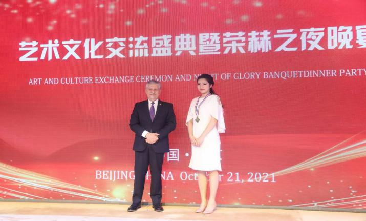 当晚19:00在北京白金五钻国际大酒店举行了“国际艺术文化交流盛典暨荣赫之夜晚宴”。现任巴哈马驻华大使罗伯特·斯特林·匡特(Robert· Sterling· Quant)、现任塞浦路斯驻华大使安东尼斯·图马齐斯(Antonios· Toumazis)、北京观唐基金会执行主席余键先生等知名文化人士出席了盛会。活动期间,由巴哈马驻华大使罗伯特·斯特林·匡特先生为唐嘉仪同学授予骑士勋章及荣誉证书,并对她在国际文化交流活动期间的表现予以高度的赞扬和肯定。