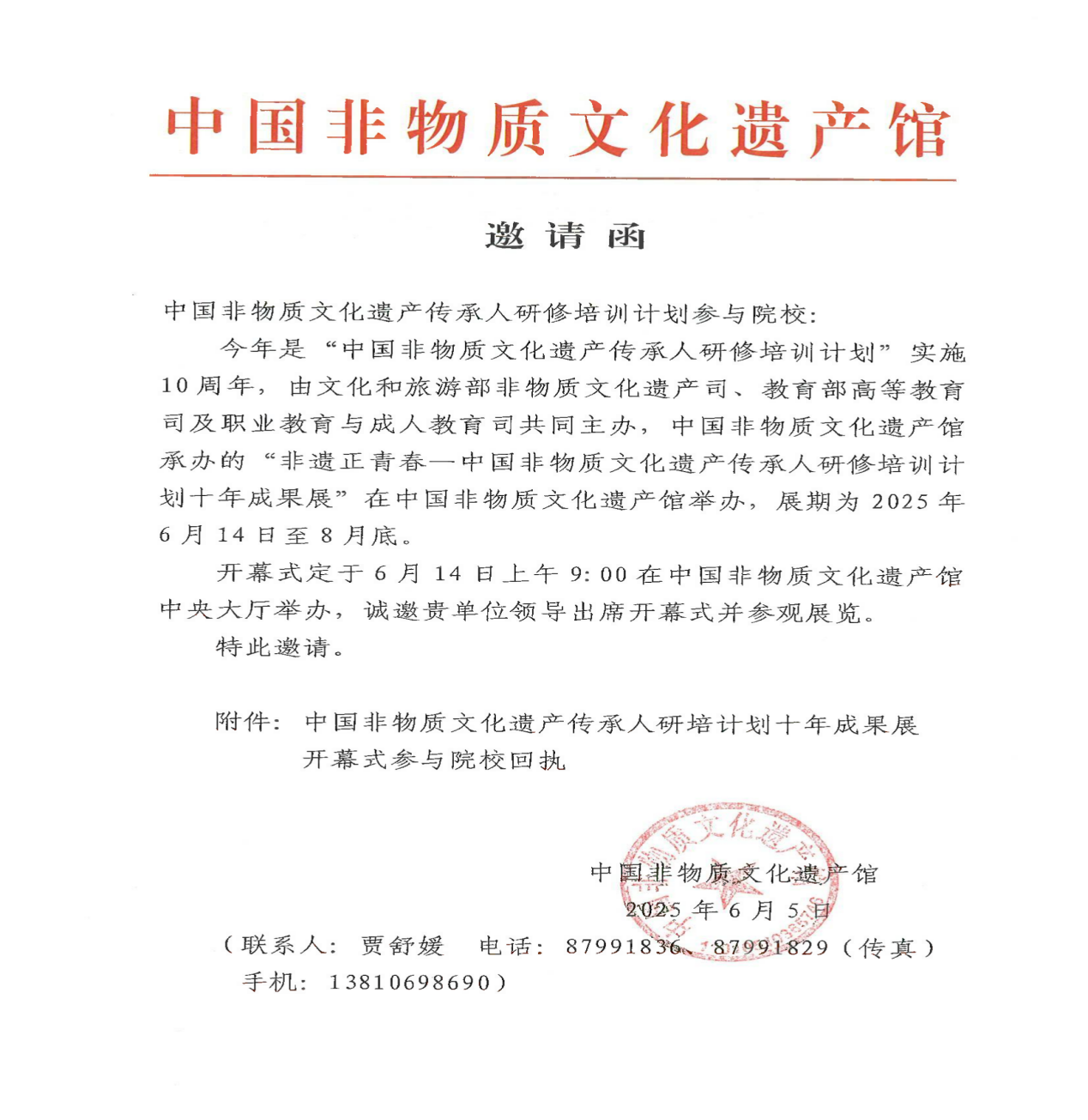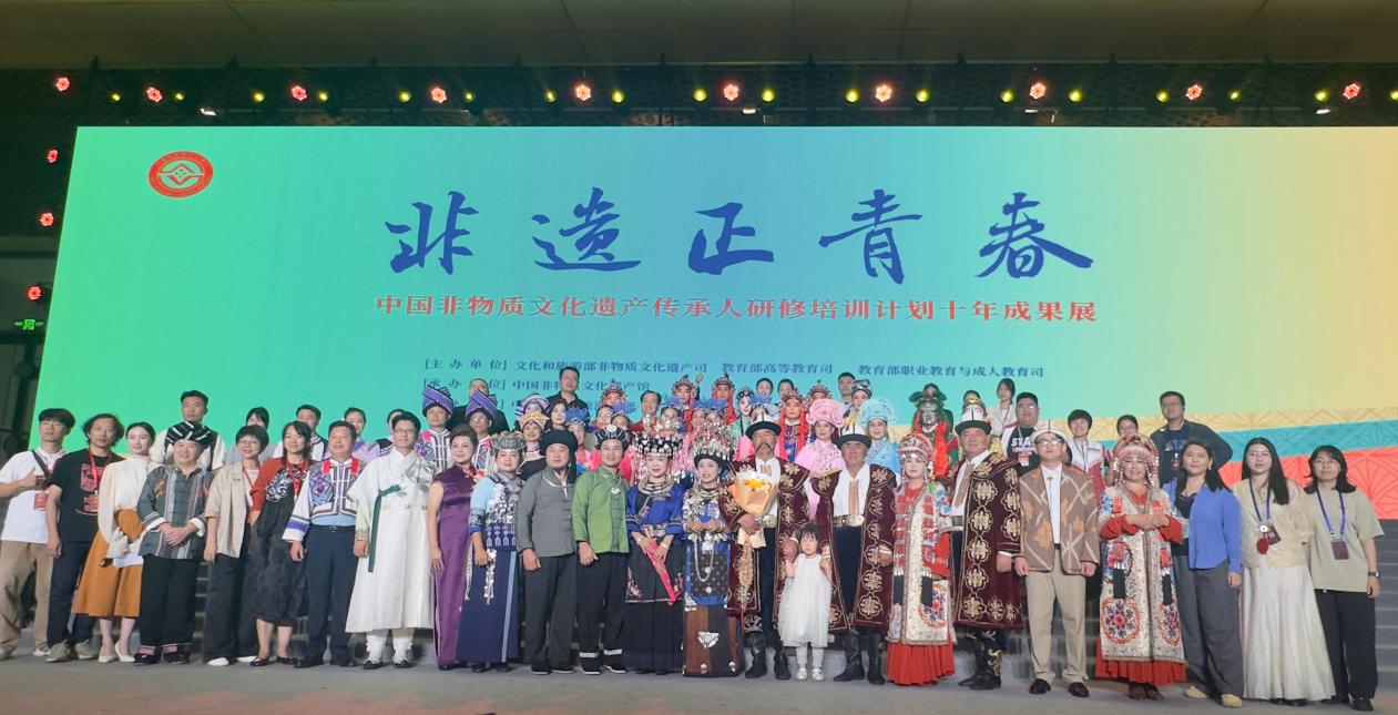 2025年6月13日,由文化和旅游部非物质文化遗产司联合教育部高等教育司、职业教育与成人教育司共同主办的 “非遗正青春——中国非物质文化遗产传承人研修培训计划十年成果展”,在中国非物质文化遗产馆正式开幕。该成果展围绕非遗传承与发展,精心设置传统工艺、表演艺术、乡村振兴、学术成果4个主题展区,集中展示了140余所参与研培计划的高校教师与学员的1000余件(套)优秀作品及学术研究成果。