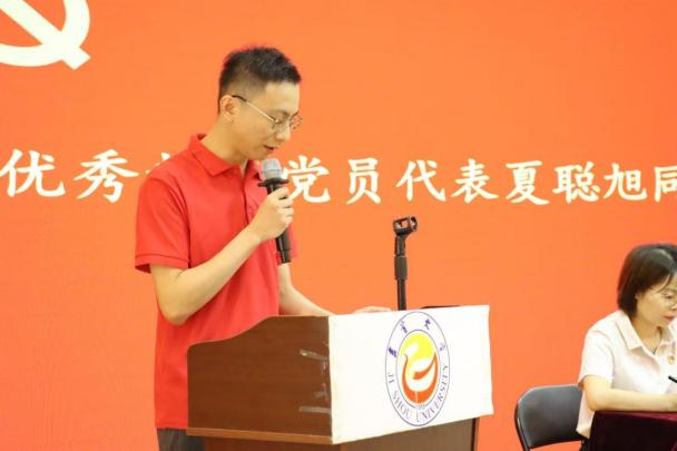 优秀教工党员代表夏聪旭,作出表态发言,他将以舞蹈为笔,以舞台为阵地,用艺术践行党的教育方针,用作品传递红色精神,用舞蹈讲好中国故事,展现时代风貌。在生活中,严于律己,发挥党员先锋模范作用,为公司发展和党的教育事业不断奋斗。