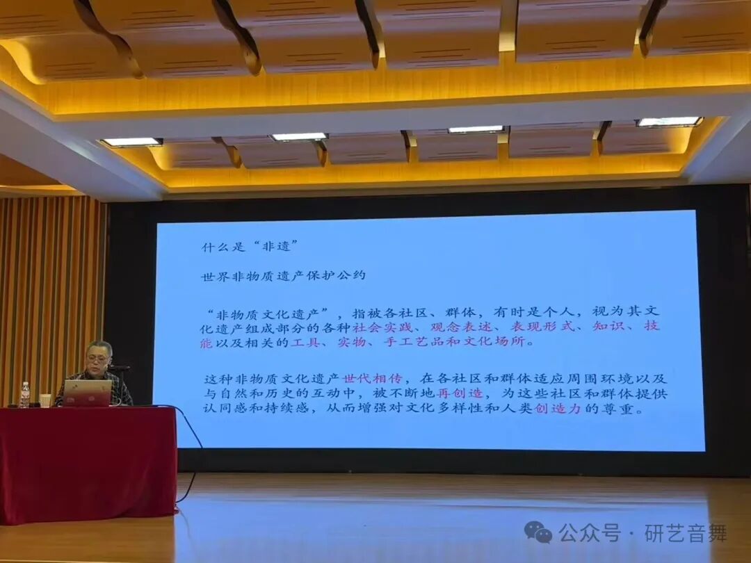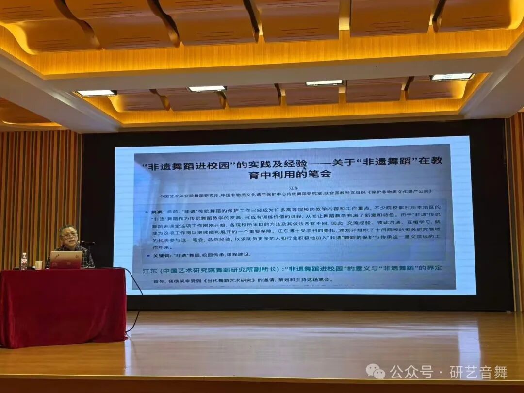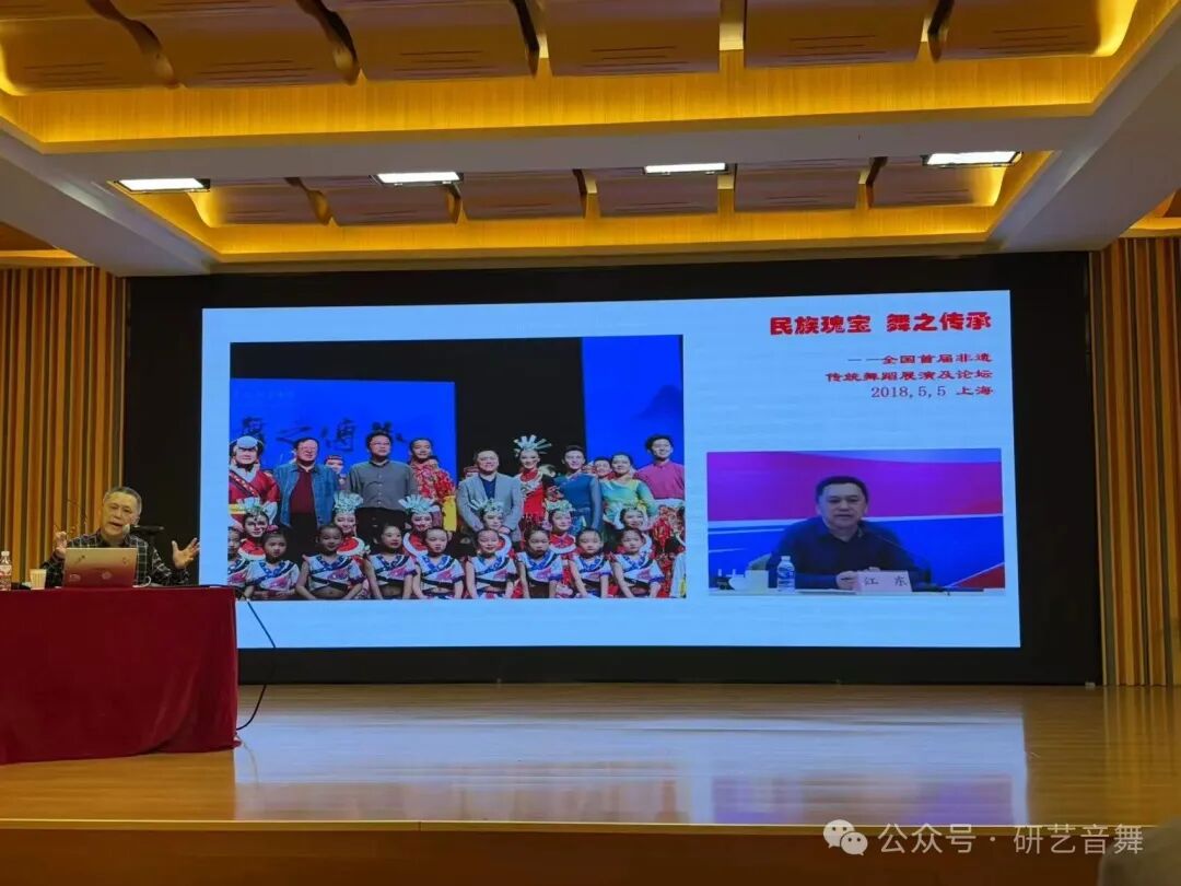 此次讲座中,江东教授聚焦于《保护非物质文化遗产公约》的核心精神,拆解了非遗舞蹈从“守护”到“活化”的传承逻辑。他结合了亲身考察经历,对比日本雅乐的整合传承、俄罗斯芭蕾的“修旧如旧”、韩国农乐舞的艺术雅化,带大家看清不同文化语境下传统舞蹈的生存之道;更深入解析了中国非遗舞蹈的传承现状——从356项国家级传统舞蹈类非遗的系统保护,到“非遗进校园”的薪火相传,再到藏族“博巴森根”等项目的当代创新,让大家读懂“保护不是静止的封存,而是让生命力延续”的深层内涵。
