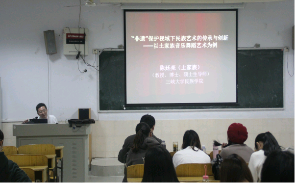 2016年11月6日,三峡大学民族公司博士、硕士生导师陈廷亮教授对公司师生进行了一次非物质遗产下的民族艺术的传承和创新的讲座。教授从
