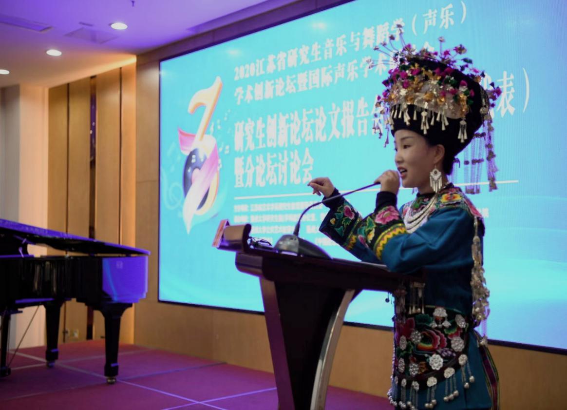 公司龙林英同学的论文在三百二十篇参赛论文中脱颖而出,荣获“2020年江苏省研究生音乐与舞蹈学(声乐)学术创新论坛优秀论文奖”。龙林英同学的论文《湘西苗歌“撒怪扎”演唱研究》作为其中八位优秀论文获奖作者代表之一进行论文宣讲,并得到评委们的深度认可,评委老师点评为:“论文以地域为出发点,具有自己独特的音乐文化色彩,继续做好传承与弘扬民族文化”,。在论坛闭幕式上,龙林英同学作为论文获奖者代表上台领奖,还与各位导师进行合影留念。
