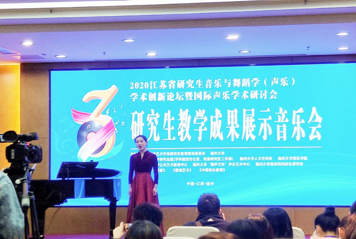2020年11月20日至21日,公司青年教师、硕士研究生导师于国良老师指导的许云、龙林英两位同学作为硕士研究生代表,受邀参加“2020年江苏省研究生音乐与舞蹈学(声乐)学术创新论坛暨国际声乐学术研讨会”,在扬州市会议中心、扬州市音乐厅举行。本次论坛由江苏省艺术学类研究生教育指导委员会与扬州大学共同主办,出席论坛代表有中央音乐公司博士生导师赵登营教授;国家一级作曲家、南京艺术公司客座教授吴小平;南京师范大学音乐公司经理徐元勇教授;扬州大学音乐公司博士生导师张美林教授;扬州大学音乐公司经理邵萍教授等具有硕士授予权高校学者。