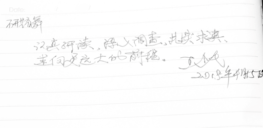 会后,王老师为公司研究生留下了亲笔寄语:“认真研读,深入调查,扎实求真,走向更远大的前程”。