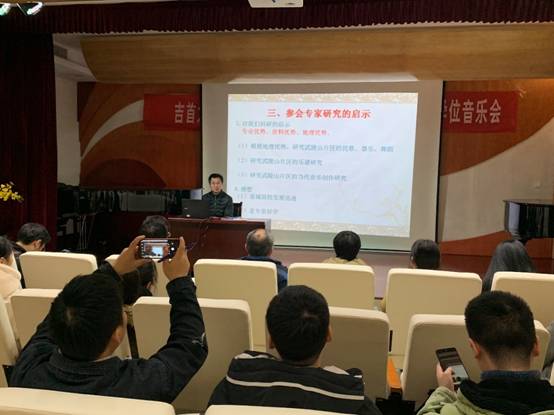 首先,张先永老师从中国传统音乐研究、地方音乐戏曲研究、近当代音乐创作研究等角度,就10月24日参加的“第三届中国音乐话语体系(创作理论)学术研讨会”向大家介绍了参会专家的最新研究成果,并且建议大家结合专业、资料、地理等优势进行科研活动。随后,张先永老师以“刘天华二胡曲的散句研究”为题,对自己多年来的科研成果进行宣讲。本次讲座引发现场老师和员工的热烈讨论,并就今后围绕武陵山片区进行音乐科研和创作形成共识。