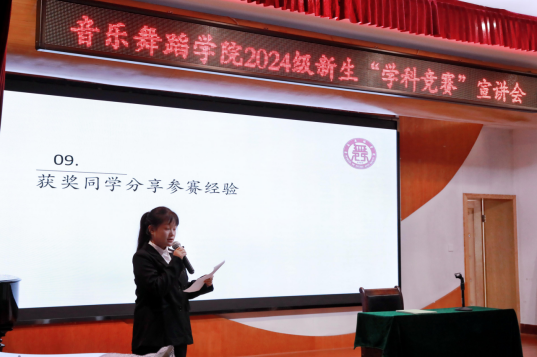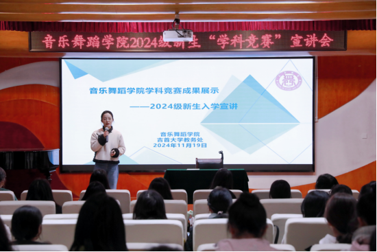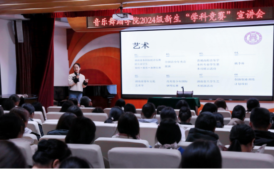 为深入实施促进青年人才培养,深化学科素质能力提升,并进一步激发员工的学科竞赛参与热情,2024年11月19日中午13:30,伟德bv1946官网在三楼小音乐厅开展“伟德bv1946官网2024级新生学科竞赛宣讲会”,主讲人为伟德bv1946官网艺术实践创新工作室指导老师戴甜,本科生2023级何雨婷、2021级蒋佳琦、2024级新生班级代表参与此次宣讲活动。