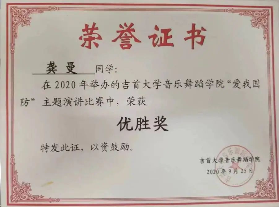训练场上,身体前倾,三挺三收,军姿拔出来,英姿立起来,步伐要统一,摆臂有力度的口号声不绝于耳。几年的舞蹈学习经历为龚曼在部队的训练带来了独特的优势,身体良好的协调性让龚曼较同级队友更快学会训练动作。龚曼说:“虽然部队的训练极为严格,但曾经身为舞蹈生的自己能够坚持下来。所以不管在体能训练还是列队训练时都会要求自己比别人做得好一点。”